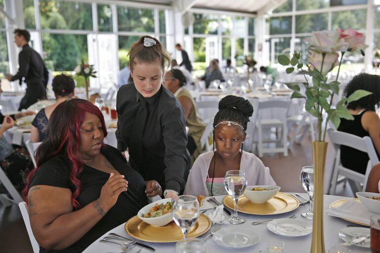 “Para mim foi uma oportunidade de possibilitar que essas pessoas soubessem que mereciam estar em um lugar como esse, como os outros”, disse Cummins. Os convidados, que chegaram de ônibus, foram recebidos com um abraço caloroso pela própria Cummins, vestida de blusa preta, calça bege e um rabo de cavalo simples, e degustaram, entre outras delícias, salmão, almôndegas com molho Bourbon, carne no espeto, peito de frango com alcachofras e molho Chardonnay, além, é claro, do bolo de casamento.
