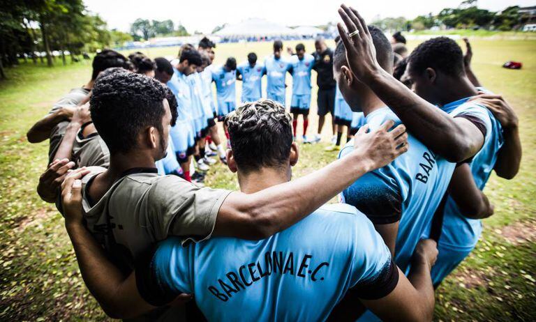 Nada de Messi, Suárez e Iniesta. Às margens da represa Guarapiranga e das lonas de um circo, na zona sul de São Paulo, quem desfila pelo campo de grama carcomida são nomes como Liomar, Leisson, Klayver, Thalyson e Piscina. Diferentemente do xará da Espanha, o Barcelona brasileiro, que disputa a quarta divisão paulista, tem elenco e estrutura bem menos glamorosos. Cores, escudo e uniforme remetem ao Barça mais famoso. Porém, garantem seus fundadores, a origem do nome nada tem a ver com o gigante catalão.