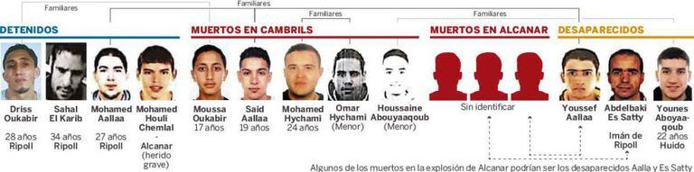 Continuam desaparecidos três terroristas, entre eles, dois dos principais líderes: Younes Abouyaaqoub, que pagou o aluguel das três vans utilizadas pela célula e também motorista da van assassina de Las Ramblas (13 mortos e mais de uma centenas de feridos), e Abdelkabi Es Satty, o imã de Ripoll, de 45 anos e suposto mentor dos crimes de Barcelona e Cambrils. Este pode ter morrido na explosão de Alcanar, uma hipótese ainda pendente de confirmação, no entanto. Para a célula, que tinha ao menos três menores de idade, era o líder.
