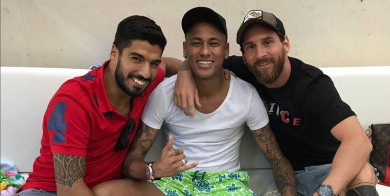 Apesar de já estar jogando e goleando com a camisa do Paris Saint-Germain, Neymar ainda não terminou de ir embora do Barcelona, nem de se separar do tridente que formou no Camp Nou com Messi e Luis Suárez. Melancólico no gramado, o argentino apareceu sorridente ao lado do brasileiro e do uruguaio em uma foto que o próprio Messi publicou no Instagram, às 19.09 horas, depois que o clube azul-grená anunciou que processaria Neymar. Na sequência da foto de Messi, apareceu uma série de imagens, divulgadas por Neymar e diferentes jogadores dos catalães, da visita do brasileiro e de Daniel Alves a Barcelona, que também reproduziam o famoso tuíte de Piqué com a frase "fica", em referência ao ex-atacante do clube espanhol.