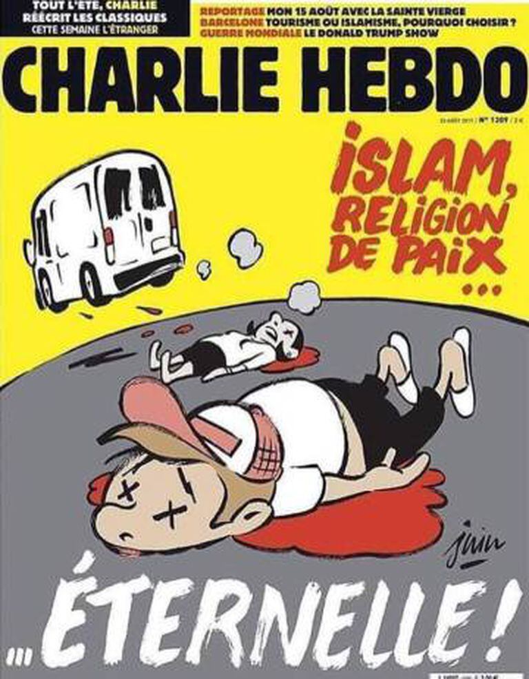 O Charlie Hebdo continua o mesmo. Ofensivo, desrespeitoso, orgulhosamente blasfemo, o humor irreverente e frequentemente vulgar do semanário francês não é feito para colher aplausos unânimes nem para consolar os aflitos. Por isso não é surpresa a capa do veterano veículo satírico depois dos atentados de Barcelona e Cambrils, na Espanha. Nela se veem dois cadáveres e uma van se afastando. O texto diz: “Islã religião de paz… eterna.”