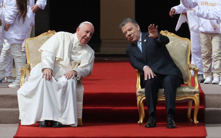Um tapete vermelho de 38 metros cruza o Pátio de Armas do Palácio de Nariño, em Bogotá. Chega um modesto Chevrolet cinza e o papa Francisco desce. A orquestra começa a tocar o hino nacional e a canção Puede Ser. Tudo agora tem a ver com a reconciliação. Muitas crianças com deficiência abraçam o Pontífice que, como sempre, se entretém com cada uma e manda o protocolo pelos ares. Fica claro a partir da primeira linha de seu discurso diante do presidente Juan Manuel Santos que ele apoiará decididamente o projeto de reconciliação que se segue aos acordos de paz que o político colombiano promoveu há nove meses depois de quatro anos de diálogo com as FARC em Havana.