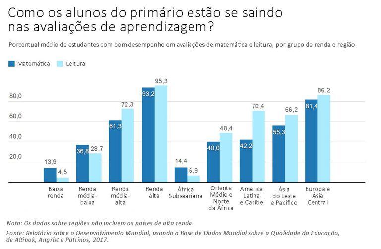 - A Base de Dados Mundial sobre Qualidade da Educação, atualizada recentemente, sugere que nos países de renda média e baixa, mais de 60% das crianças avaliadas não conseguiram alcançar habilidades mínimas em matemática e leitura. Já nos ricos, quase todas as crianças ultrapassaram esse nível.