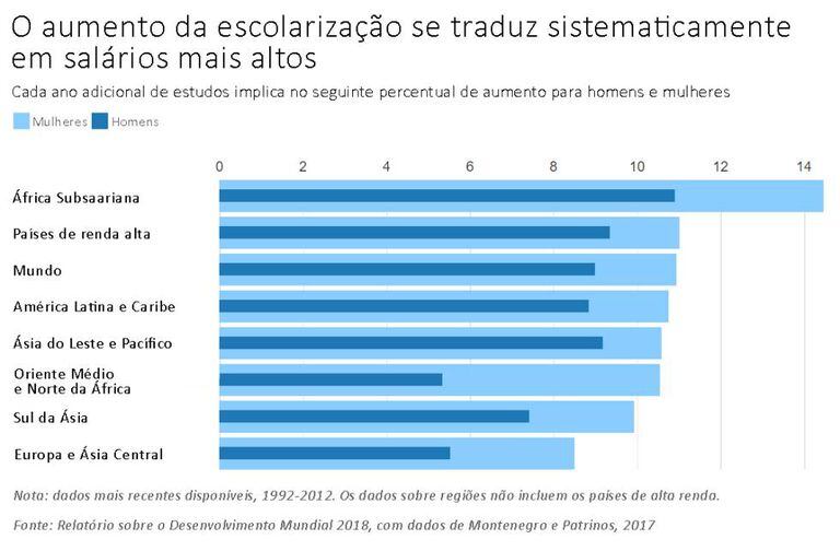 Segundo o documento, a crise global de aprendizagem não apenas impede esses jovens de terem salários maiores – de 9% a 11%, no caso da América Latina e Caribe (veja o gráfico) –, mas também aprofunda as diferenças entre ricos e pobres.