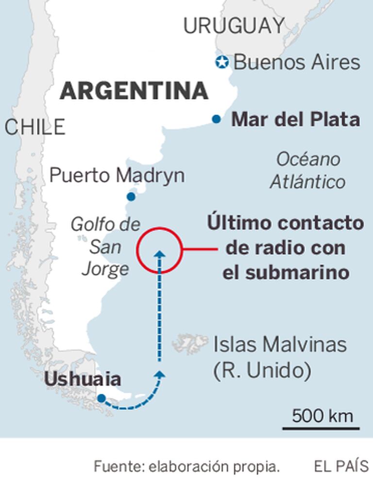 A busca pelo submarino se tornou uma causa nacional. A principal hipótese da Marinha é que a embarcação teve algum problema elétrico e por isso perdeu sua capacidade de comunicação. Foi descartada, até agora, a hipótese da ocorrência de um incêndio a bordo; acredita-se que o ARA San Juan ainda está em movimento, navegando em direção ao deu destino, como prevê o protocolo em casos assim. As chamadas via satélite corroboram essa hipótese. “Não se tem nenhum sinal grave do submarino. Ele simplesmente parou de se comunicar”, disse o porta-voz da Marinha argentina, Enrique Balbi. Quando emitiu as suas últimas coordenadas, a embarcação estava realizando operações de controle de pesca clandestina a cerca de 400 quilômetros da costa, na altura do Golfo San Jorge, entre Puerto Deseado e Comodoro Rivadavia, na Patagônia argentina.