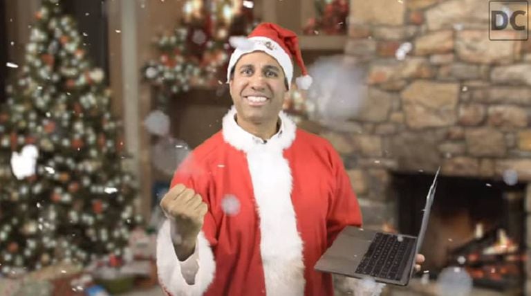 Presidente da Comissão de Comunicações, Ajit Pai se vestiu de Papai Noel e brandiu a espada de Jedi para promover sua proposta de acabar com as proteções da era Obama