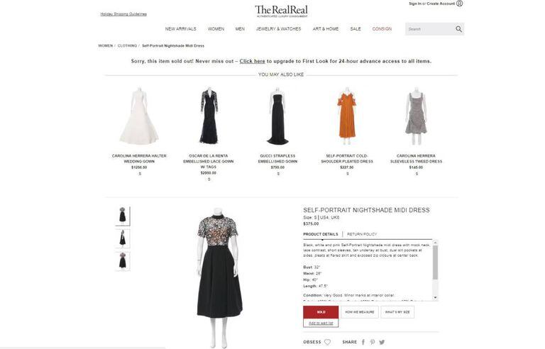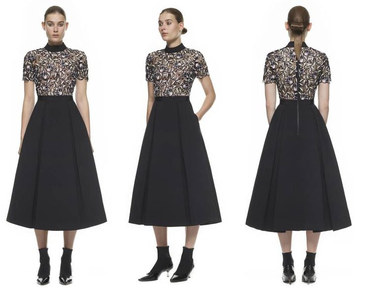 Trata-se de um traje preto e branco, chamado Nightshade Midi Dress, da grife londrina Self-Portrait, que custa 300 libras (cerca de 1.320 reais), embora no site apareça em promoção pela metade do preço. A parte superior é de renda preta de guipur com detalhes florais em rosa e branco, e a inferior, uma saia toda preta. Um vestido que a grife criada em 2013 tem em sua versão curta, que também se esgotou. Esse segundo traje também está à venda no The RealReal, ou estava, porque nesse site tampouco é possível comprá-lo, pois todos os tamanhos estão esgotados.