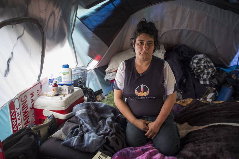 Em uma esquina encontramos Jennifer de León. Praticamente sem dentes, explica que tem 40 anos e mora nesta esquina desde 2009, em uma barraca que começou pequena, mas agora ocupa cerca de seis metros quadrados. Seus pais moram em Desert Hot Springs, a duas horas daqui. Não fala com eles. Vive de uma pensão da Seguridade Social desde os 18 anos que hoje chega a 997 dólares (cerca de 3.200 reais), e no entanto continua na rua. Simplesmente esta é sua vida. Acabou aqui depois de se envolver com o crack e a metanfetamina. Toma banho no albergue mais próximo. Se não precisa ir até lá, faz suas necessidades em um cesto de lixo e joga na rua.