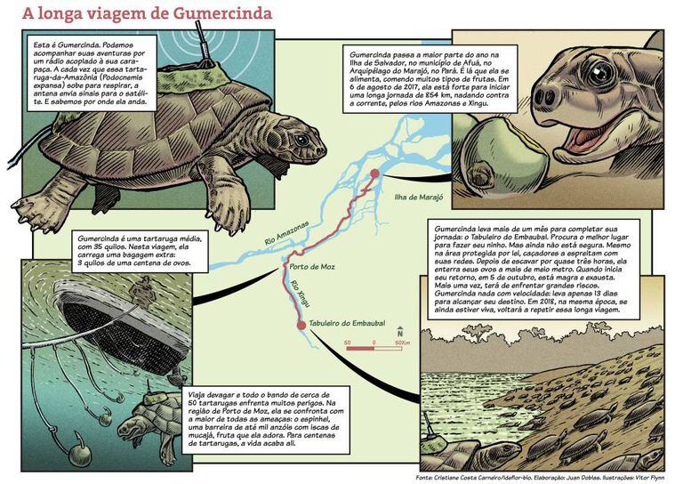 Gumercinda é uma das oito tartarugas monitoradas pelos biólogos Cristiane Costa Carneiro, a “Cris das Tartarugas”, e Juarez Pezzuti, o “Juca”, professor do Núcleo de Altos Estudos Amazônicos da Universidade Federal do Pará (UFPA), em Belém. Em 2013, eles botaram em cada uma delas um rádio e uma antena para acompanhá-las por satélite. Os ribeirinhos chamam essa antena de “chifre”. A de Gumercinda é a única que, até hoje, permanece ativa. A bateria das outras pode ter acabado ou o chifre se perdido ou algo mais brutal. Gumercinda, não. Ela segue sob vigilância, como se estivesse em um reality show no qual ela é a única que não sabe que é estrela. Ou será que sabe?