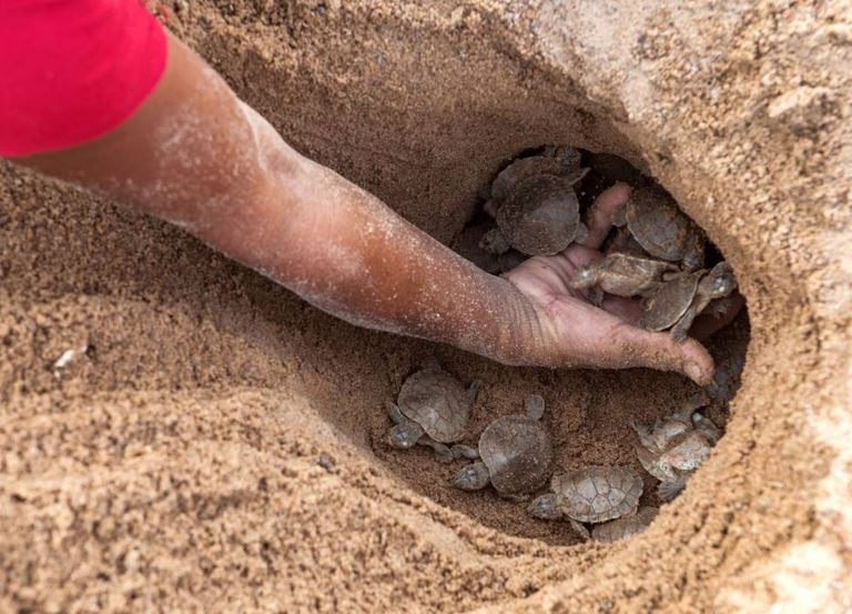 Na madrugada de 1o de janeiro de 2018, a Ilha do Juncal já tinha alagado muito, mais cedo do que outros anos. Centenas de filhotes não conseguiam alcançar a superfície. Morriam afogados ainda dentro da areia. Era chegado o momento de fazer uma espécie de “cesariana”, escavando os ninhos e ajudando-os a nascer.