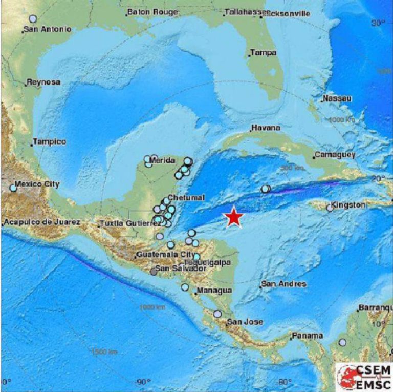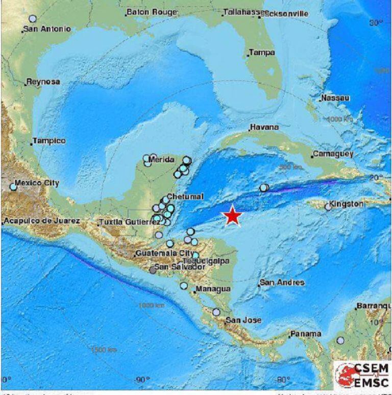 O sismo ocorreu no mar, entre a ilha de Cuba e as costas da Honduras e Belize, como mostram os mapas do USGS. De acordo com seus sismógrafos, o epicentro está localizado a 202 quilômetros da localidade hondurenha de Barra Patuca, com 2.758 habitantes, a 245 quilômetros do município de Puerto Lempira (Honduras), onde vivem 4.856 pessoas, e a 303 quilômetros de George Town, nas ilhas Cayman.