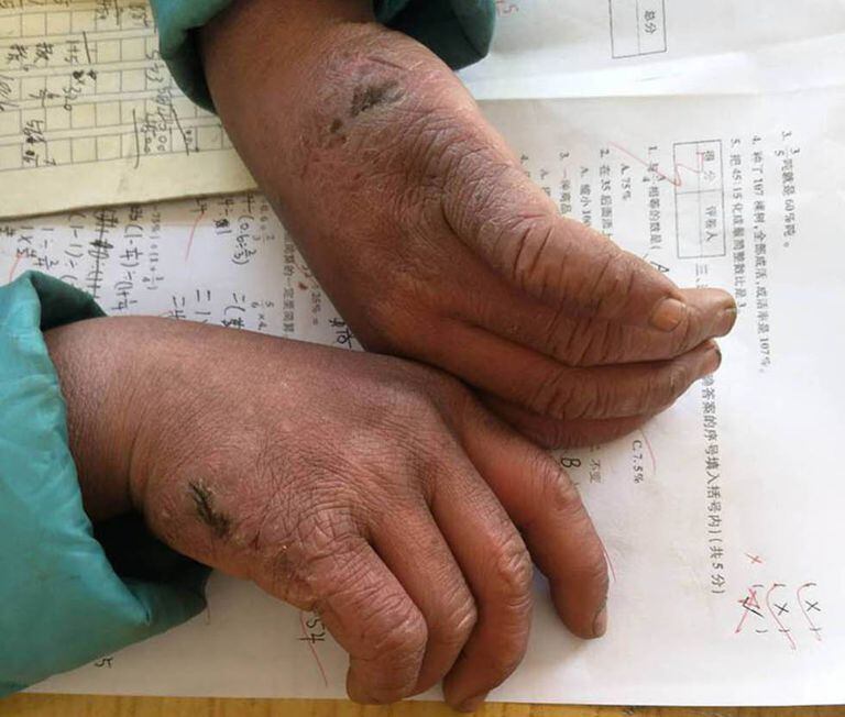 Outra foto mostra mãos ressecadas e muito machucadas, que poderiam ser as de um idoso. Mas realmente são as mãos congeladas de Fuman, que não tem luvas para se proteger nas longas caminhadas. Por trás do menor com as roupas úmidas, é possível ver como outros garotos, colegas dele no terceiro ano do primário, riem do seu aspecto.