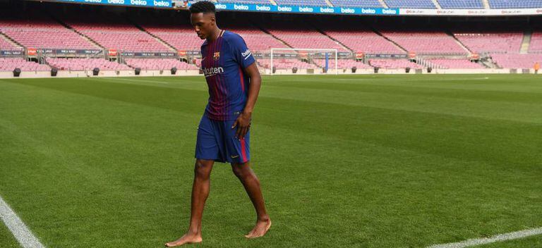 Depois de assinar, ao lado do presidente do Barcelona, Josep Maria Bartomeu, seu contrato até junho de 2023 com o clube catalão, Yerri Mina (Guachené, Colômbia; 23 anos) entrou no estádio do Camp Nou com o uniforme do time. Até ali, tudo ocorria de modo bastante formal. Mas, antes de pisar pela primeira vez no gramado de sua nova casa, Mina, ex-Palmeiras, tirou as chuteiras e as meias. Motivo? Um versículo do antigo testamento: “Todo lugar onde a planta do teu pé pisar será teu”. O zagueiro central colombiano concluiu sua explicação: “Minha mãe é muito ligada em Deus, eu também. É uma coisa que faço sozinho em minha casa. Quero sentir o campo”, disse.