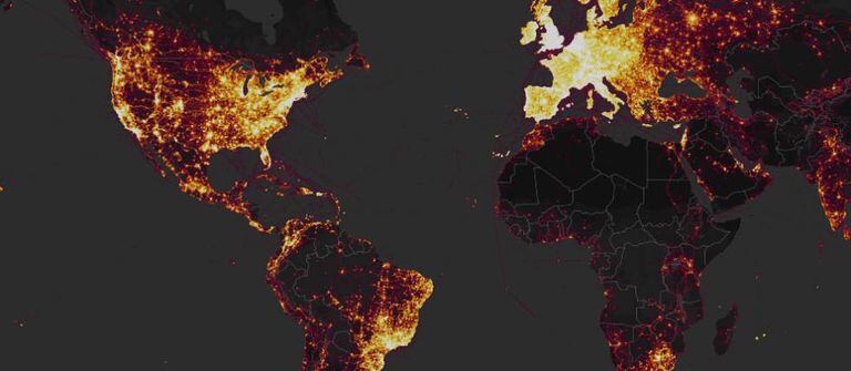 O mapa, iluminado com luz amarela nas áreas com usuários ativos, foi divulgado em novembro de 2017, mas a Strava só contextualizou a informação no último sábado: registra 1 bilhão de atividades e 3 trilhões de pontos GPS ao longo de dois anos. O nível de detalhe é implacável. Em áreas como os Estados Unidos ou a Europa, onde se encontra a maior parte dos 27 milhões de usuários do bracelete Fitbit ou similar, há amplas áreas iluminadas. Mas em outras partes, como Iraque, Síria ou regiões de conflito na África, aparecem apenas pequenas manchas.