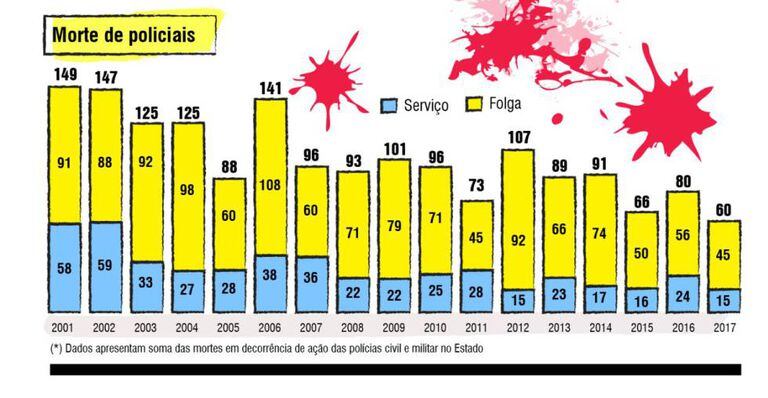 Os números oficiais sobre as morte de policiais também cresceram: é o maior em 18 anos. Houve o aumento de 150% na comparação de 2017 com um ano antes: 60 mortos frente 24 de 2016. Mas um detalhe nas análises estatísticas: desde o ano passado, a SSP passou a divulgar mortes de policiais em serviço e durante a folga de forma discriminada. Nos períodos anteriores, a pasta não contabilizava no balanço oficial quando um PM ou agente morria fora do expediente, o que gera este aumento acentuado.