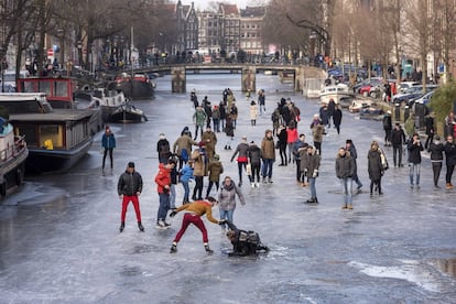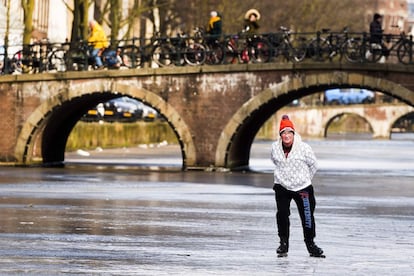 Com temperaturas de até 10 graus baixo zero e com os canais de Amsterdã congelados, as imagens de holandeses de todas as idades patinando deram a volta ao mundo.EVERT ELZINGA (AFP)As vias de água navegáveis, cheias de barcos de passeio para turistas, foram ocupadas pelos vizinhos aproveitando o gelo natural.EVERT ELZINGA (AFP)Os que não sabem patinar, descem aos canais para tirar fotos. Os principiantes levam seus patins, mas empurram cadeiras sobre a superfície dura para não se cair.Mike Corder (AP)O que não se vê nas fotos é a tensão dos dias anteriores à geada que permitiu que os canais congelassem.EVERT ELZINGA (EFE)Meteorologistas informam minuto a minutos o avanço da frente frias. Os mais experientes medem a espessura do gelo e as prefeituras advertem aos cidadãos sobre os locais seguros. Em Utrecht também é possível patinar nos canais.Mike Corder (AP)Em Haia, onde não há tantos canais, a lagoa do parque de Clingendael, o maior da cidade, serve de pista.EVERT ELZINGA (AFP)Também houve alguns acidentes, como o de um idoso de 75 anos que morreu no hospital depois de ter sido retirado da água gelada por alguns jovens. Uma criança também acabou no hospital e vários tombos foram registrados.SOCIAL MEDIA (REUTERS)Um homem é ajudado por um patinador depois de cair no canal congelado em Prinsengracht.EVERT ELSINGA (EFE)Como o tempo está melhorando, as autoridades locais estão avisando patinadores de que o gelo começará a ceder com mais facilidade e é preciso cuidado.MICHAEL KOOREN (REUTERS)A geada coincidiu com os Jogos Olímpicos de Inverno, recém celebrados em Pyeongchang, onde a Holanda ganhou 20 medalhas ao todo. A patinação de velocidade é uma paixão nacional, e as façanhas dos corredores dominaram as notícias.MICHAEL KOOREN (REUTERS)