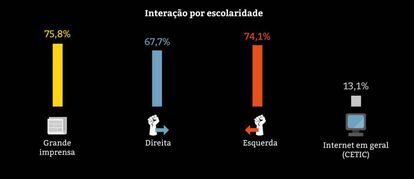 Outra constatação que chama atenção é a quantidade de leitores com educação superior: são 75,8% dos que interagiram com páginas da imprensa tradicional, 67,7% dos que interagiram com páginas de direita e 74,1% dos que interagiram com páginas de esquerda. Do total de usuários de internet no Brasil, apenas 13,1% têm ensino superior, segundo o Centro Regional de Estudos para o Desenvolvimento da Sociedade da Informação (Cetic.br).
