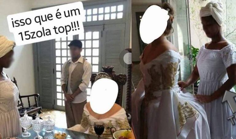 Nas fotos, a garota branca, vestida de sinhá, é servida por três atores negros, que estão caracterizados como escravos. Uma das atrizes aparece ajeitando o vestido da garota. Nas imagens, aparece escrito “15zola top” e “top”. O ensaio fotográfico foi produzido por uma empresa que organiza festas, a Cerimonial Lorena Machado.
