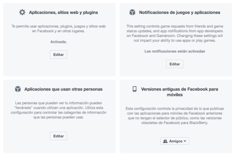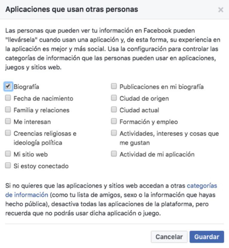Conforme já mencionamos, a Cambridge Analytica não só acessou aos dados pessoais dos 270.000 usuários que lhe autorizaram como também chegou aos dados dos amigos desses usuários, multiplicando seu alcance até os 50 milhões de pessoas. Para controlar a informação à qual outros aplicativos têm acesso através de nossos amigos, é preciso ir novamente ao menu dos aplicativos em “configurações” e ali entrar em “aplicativos que outras pessoas usam”.