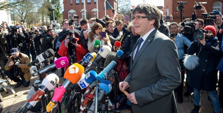 Dez minutos antes das duas da tarde, o ex-presidente do Governo catalão, Carles Puigdemont, cruzou a porta da prisão de Neumünster, na Alemanha, para festejar sua libertação diante dos jornalistas. Acompanhado de seu advogado alemão, Puigdemont leu um comunicado em alemão e em inglês, e não respondeu perguntas.