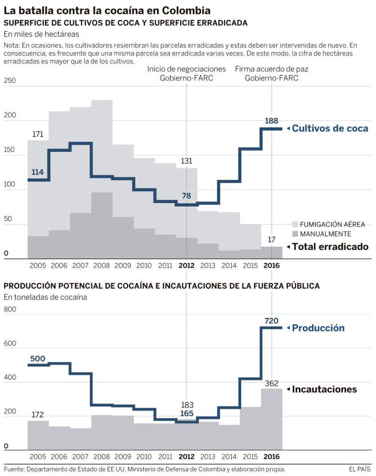 Assim, em 2008, a droga restante depois dos confiscos realizados pelas autoridades alcançava 59 toneladas (um potencial produtivo de 265 toneladas, menos as 206 apreendidas). O saldo melhorou em 2012, quando foi interceptada mais cocaína do que a Colômbia podia produzir naquele ano (165 toneladas de potencial produtivo, frente a 183 confiscadas), como consequência da apreensão de narcóticos produzidos em anos anteriores ou em outros países. Entretanto, em 2016, a insuficiência da estratégia antidroga ficou evidente: o volume de cocaína disponível disparou para 357,6 toneladas (um potencial de produção de 720 toneladas, menos 362,4 confiscadas).