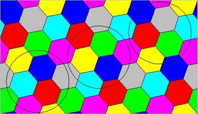 Realmente, não pode ser mais de sete. Com apenas sete cores se pode colorir o plano a partir de uma tesselação de hexágonos de diagonal ligeiramente inferior a um, em que todos os polígonos adjacentes tenham uma cor diferente. Partimos de um dos hexágonos e o pintamos de uma cor, e os seis adjacentes de outras seis cores diferentes (e assim sucessivamente). Se dois pontos estiverem à distância 1, como os hexágonos têm diâmetro menor que 1 cairão em pentágonos diferentes e adjacentes, por isso terão cor diferente.