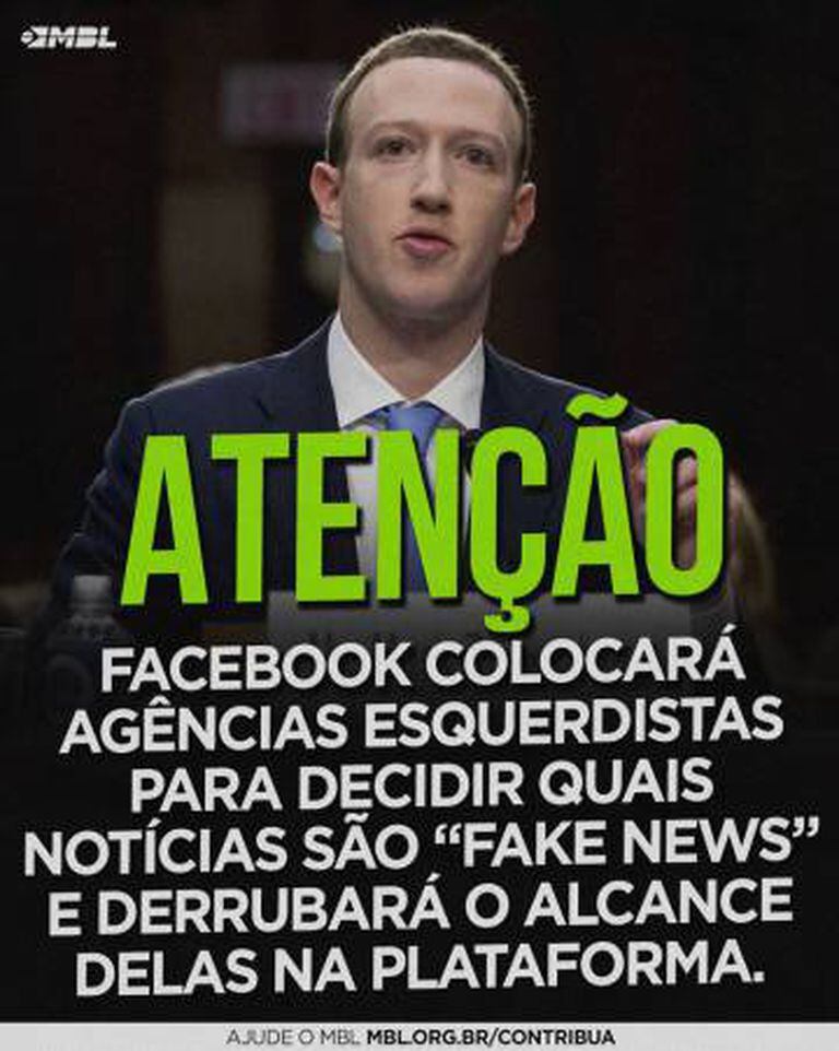 "Tenho muita preocupação, tenho medo de que tudo vai parar", diz em um vídeo difundido no Youtube Renan Santos, um dos fundadores do Movimento do Brasil Livre (MBL). "Se a gente perder essa luta contra a censura, nossa força vai acabar". Grupos da direita, principalmente o MBL, lançaram nos últimos dias uma intensa campanha contra a nova política do Facebook para tentar evitar a divulgação de noticias falsas pela rede social. Segundo esses grupos, a iniciativa do gigante tecnológico para combater as chamadas fake news é um "ataque à liberdade de expressão" e uma tentativa de "censura" instigada pela "extrema esquerda". "Querem estrangular a direita brasileira", lamenta Santos na mesma mensagem. Em vídeos e postagens publicados na internet, os ativistas tentam desqualificar o trabalho das agências profissionais de checagem de dados escolhidas como parceiras pelo Facebook e até divulgam perfis pessoais dos jornalistas desses veículos para classificá-los como "militantes da esquerda". A ironia é que dirigentes do MBL como o próprio Santos, Kim Kataguiri ou Arthur do Val, mais conhecido pelo apelido de Mamãefalei, e inclusive um deputado federal e um procurador da Justiça do Rio de Janeiro, difundiram dados falsos para criticar o combate aos dados falsos.