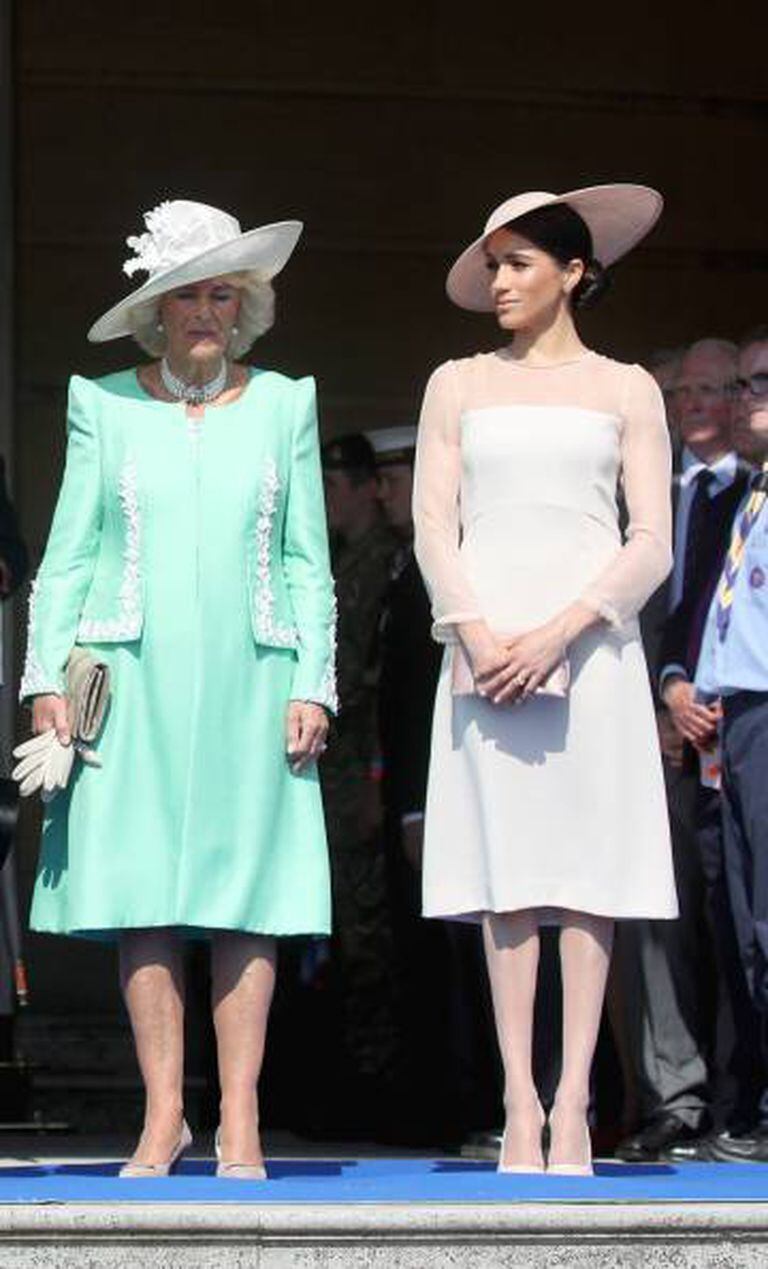 Em sua primeira aparição pública depois do casamento, o look da duquesa de Sussex chamou a atenção pelas meias, transparentes, mas com um toque esbranquiçado que fez suas pernas parecerem ainda mais claras que as de sua quase sogra, Camilla da Cornualha. Foi por causa das meias, pois as mulheres da família real, por protocolo, não devem usar roupas que deixem as pernas descobertas, por isso sempre usam meias, mesmo que sejam finas. A mesma coisa acontece em relação a cruzar as pernas ou usar saias curtas: para evitar que se veja mais pele do que o desejado se exige recato, muito recato.