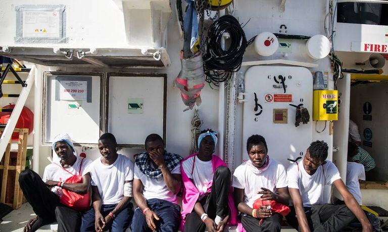 Todas as cobertas do navio estão lotadas de gente, há fila para receber atendimento médico, as pessoas esperam, esperam e esperam; há crianças que brincam aqui e ali... de manhã esperavam pacientemente para receber o café da manhã (chá quente, duas bolachas energéticas e uma focaccia). “Tínhamos comida para dois dias. É preocupante porque esta noite não teremos mais”, acrescentou Vimard. Alguns dos resgatados estão doentes, têm ferimentos de bala de sua passagem pela Líbia ou ferimentos da viagem, muitos têm sarna, alguns febre... Todos estão exaustos e muitos traumatizados pela dura travessia e tudo o que a antecedeu. Entre eles há sete mulheres grávidas e 123 menores que viajam sozinhos. Os homens dormiram a céu aberto, as mulheres e crianças em lugares abrigados.