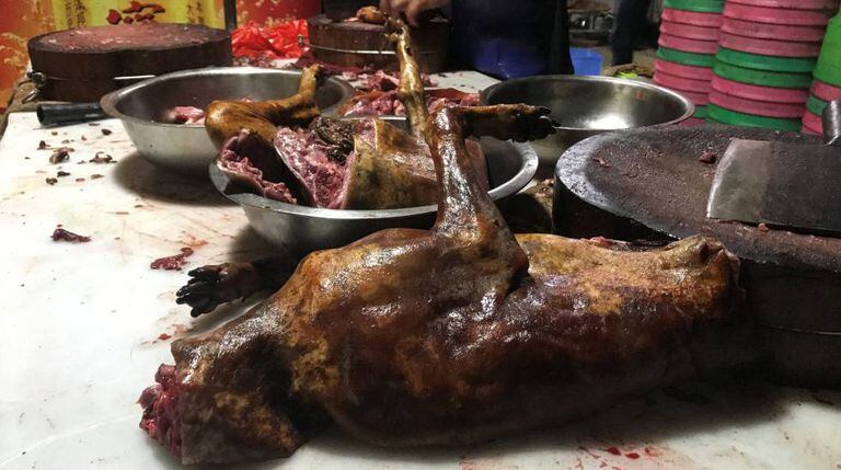 Um simples passeio pelo mercado Dashichang basta para conhecer a magnitude da matança. Cães e gatos (estes em menor quantidade) se amontoam em jaulas nas bancas, ou já sacrificados nos açougues, e são exibidos assados. Além disso, é fácil ver tanto pessoas comendo-os e brindando com licor como ecologistas e animalistas comprando animais ainda vivos para salvá-los. Um cachorro custa cerca de 45 reais neste mercado.