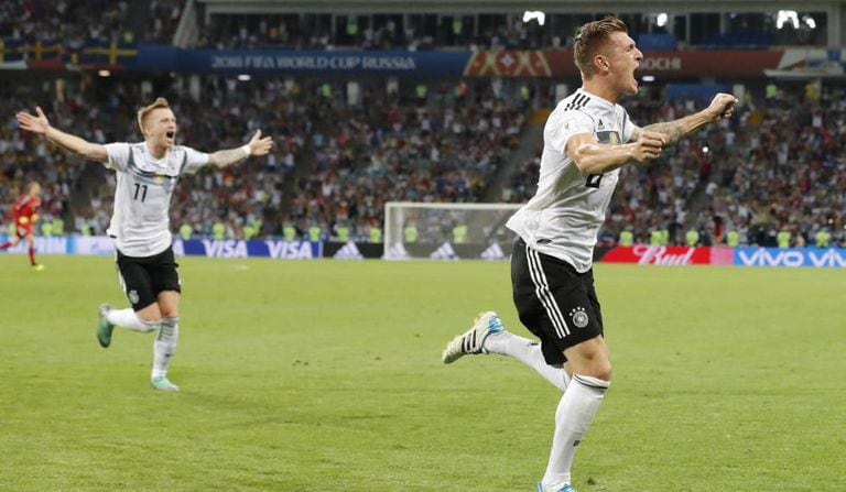 A Alemanha buscou, nos acréscimos, a primeira vitória na Copa do Mundo Rússia 2018 e se reabilitou no torneio. O 2 a 1 veio contra a Suécia, pela segunda rodada do Grupo F, com gols de Reus no começo do segundo tempo e Kroos, em cobrança de falta, no último minuto da etapa final; Toivonen foi quem marcou para os suecos. No primeiro tempo, os alemães começaram pressionando muito o adversário, que só conseguiu equilibrar a partida a partir dos vinte minutos. Depois de um passe errado de Kroos, Toivonen recebeu na área aos 32 minutos e encobriu Neuer com um belo toque na saída do goleiro, fazendo 1 a 0.