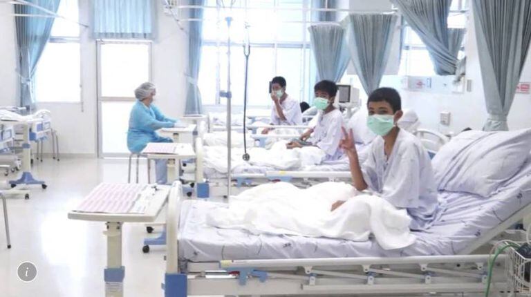 Os “13 javalis”, assim apelidados pelo nome do time de futebol que compõem, já estão todos a salvo e internados no hospital provincial Prachanukroh de Chiang Rai. Permanecerão pelo menos uma semana no oitavo andar da sua chamativa ala nova, onde dezenas de policiais custodiam todas as entradas para que ninguém se aproxime deles. Ninguém, nem mesmo seus pais, pode estar em contato direto com eles por enquanto. Seus familiares só podem vê-los pelo vidro. Seu sistema imunológico está tão debilitado após nove dias sem comer e 17 na caverna que os médicos temem que qualquer contato possa transmitir doenças. Nesta quarta-feira, as autoridades tailandesas publicaram as primeiras imagens dos meninos depois do resgate.