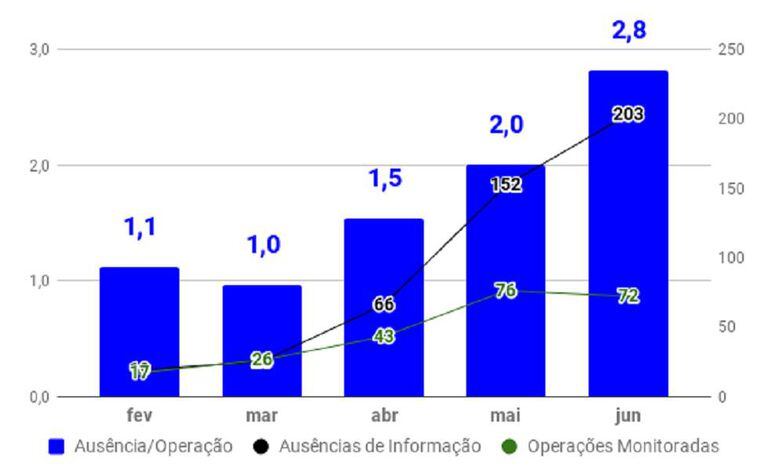 É importante notar que este quadro de ausência de informações essenciais tem se agravado nas páginas dos jornais e sites, onde registros incompletos passaram a ser cada vez mais comuns. A ocorrência de lacunas cresceu mês a mês, seguindo o aumento do número de operações. Esse cenário modificou-se em junho, quando o número de operações apresentou uma ligeira queda, enquanto o número de ausências de informação foi 33% maior do que o do mês anterior. Se, em março, registramos apenas 25 casos em que havia insuficiência de informações, em junho foram registrados 203 casos. Esse aumento expressivo nos faz cogitar se existe uma política de restrição à informação por parte das autoridades que teriam por dever prestar contas de suas ações à sociedade.