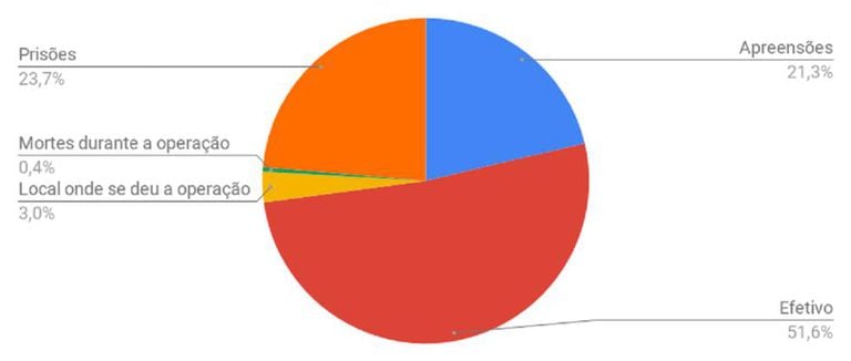 Até o momento, entre 16 de fevereiro e 30 de junho, contamos 465 vezes em que uma informação sobre operações não foi encontrada no nosso processo diário de acompanhamento das mídias. O número do efetivo das forças de segurança empregadas nas operações foi o dado mais ausente nas fontes que analisamos (240 vezes), enquanto que dados sobre as prisões efetuadas nas operações monitoradas estiveram ausentes em 110 casos.