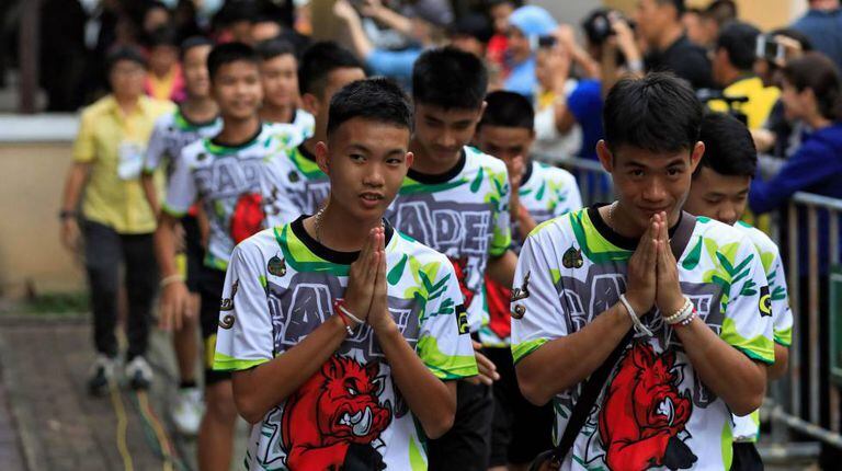 Visivelmente nervosos, mas com um grande sorriso e muito agradecidos. Assim falaram à imprensa pela primeira vez, nesta quarta-feira, os 12 garotos tailandeses e seu treinador para relatar sua odisseia dentro da caverna de Tham Luang. “Foi um milagre”, disse um deles, ao ser perguntado pelo momento em que escutaram os dois mergulhadores britânicos que os localizaram após 18 dias presos.