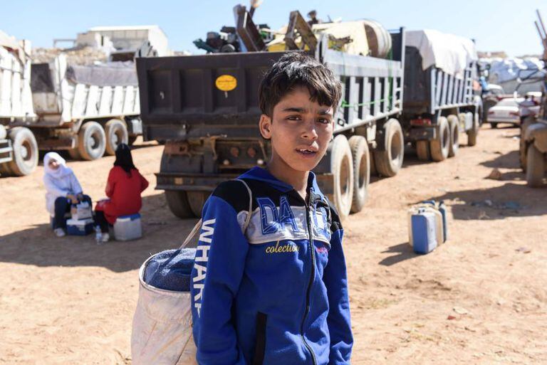 Faltando ainda que os últimos veículos deixem o posto de controle militar, o pequeno Bouzeid prossegue em seu empenho de se esquivar de agentes humanitários e militares e entrar como penetra na comitiva. Do seu ombro pende uma bolsa de tecido com uma toalha e três trocas de roupa. As três que possui. "Quero voltar para a minha mãe", continua murmurando.