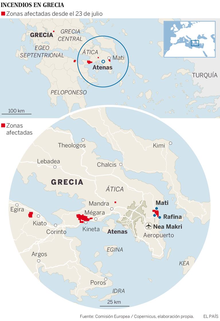 Nesta terça-feira, 24, foram encontrados corpos de 26 pessoas carbonizadas na costa de Argyros em Mati, a cerca de 15 metros do mar, segundo informou o prefeito de Rafina-Pikermiou, Evangelos Bournos, à agência estatal ANA-MPA. O presidente da Cruz Vermelha grega, Nikos Economopoulos, declarou a SKAI que o grupo, que foi encontrado abraçado, perdeu a vida quando tentava fugir para o mar. O Ministério de Previdência informou que mais de 100 pessoas têm queimaduras de diversos graus e 11 se encontram em estado grave.