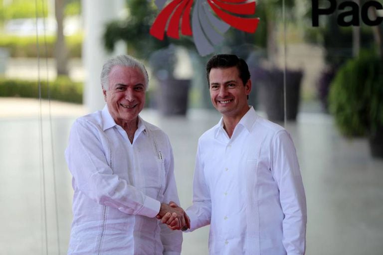 “O Mercosul e a Aliança do Pacífico não são sistemas idênticos em seus formatos e conteúdos. Tampouco são incompatíveis ou excludentes. Se engana quem diz que o são”, afirmou o presidente do Uruguai, Tabaré Vázquez, um dos dois líderes do bloco sul-americano presentes no México, ao lado do brasileiro Michel Temer. A declaração do presidente lançou novamente pontes entre os dois grupos que se cortejam há anos, mas cuja aproximação começou a tomar forma no ano passado. “Enviamos ao mundo um sinal claro de que, juntos, promoveremos a integração regional e o livre comércio”, disse o presidente do México, Enrique Peña Nieto, que entregou a presidência pro tempore do bloco pacífico ao peruano Martín Vizcarra. Vázquez, o único presidente de esquerda presidente presente na cúpula, disse que a integração não é uma varinha mágica capaz de resolver os problemas, mas que poderia servir como instrumento para combater a pobreza, um dos principais problemas da região.
