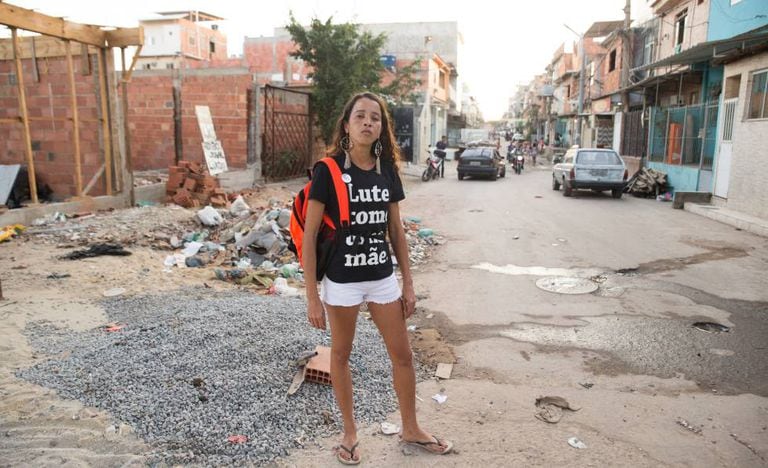 Bruna da Silva corre. Pendurada em seus ombros está uma mochila laranja com cadernos e o uniforme de escola manchado de sangue de seu filho Marcos Vinícius, o adolescente de 14 anos assassinado durante uma operação policial no Complexo da Maré em 20 de junho. Atrás dela, dois policiais militares a perseguem com as mãos nas pistolas presas em suas cinturas. Uma viatura segue o movimento.