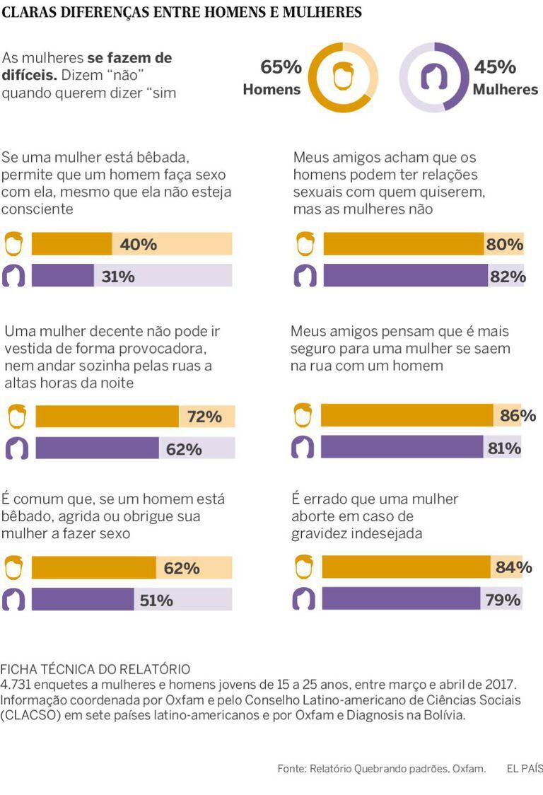 “É algo que têm em sua cabeça e reproduzem em seus comportamentos”, diz Belén Sobrino, responsável pelo relatório Rompendo Moldes: Transformar Imaginários e Normas Sociais para Eliminar a Violência Contra as Mulheres, da ONG Oxfam Intermon, que analisa jovens de 15 a 25 anos com mais de 4.000 questionários com pessoas de áreas urbanas e com ensino médio e universitário de oito países da América Latina: Bolívia, Colômbia, Cuba, El Salvador, Guatemala, Honduras, Nicarágua e República Dominicana. Mais de 80% concordam os homens podem ter relações sexuais com quem quiserem, mas que as mulheres não podem. E três em cada quatro consideram incorreto que uma mulher aborte em caso de gravidez indesejada.