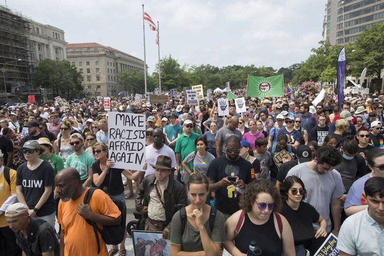 Os arredores da Casa Branca atraíram uma heterogênea mistura de grupos que protestavam contra a presença da extrema direita em uma das cidades mais progressistas e com maior população negra dos Estados Unidos. Havia manifestantes de grupos afro-americanos, judeus, veganos, homossexuais… Muitos levavam cartazes contra Trump e o “ódio”. Japharii Jones, negro de 33 anos e integrante da organização Black Lives Matter, considerava que a extrema direita tinha sofrido um “enorme fracasso” ao atrair tão pouca gente a Washington. “Trump quer nos dividir, mas como você pode ver estamos mais unidos”, dizia, torcendo para que esta “força” de protesto se reflita nas eleições legislativas de novembro, nas quais serão renovados a maior parte do Congresso e dezenas de Governos estaduais.