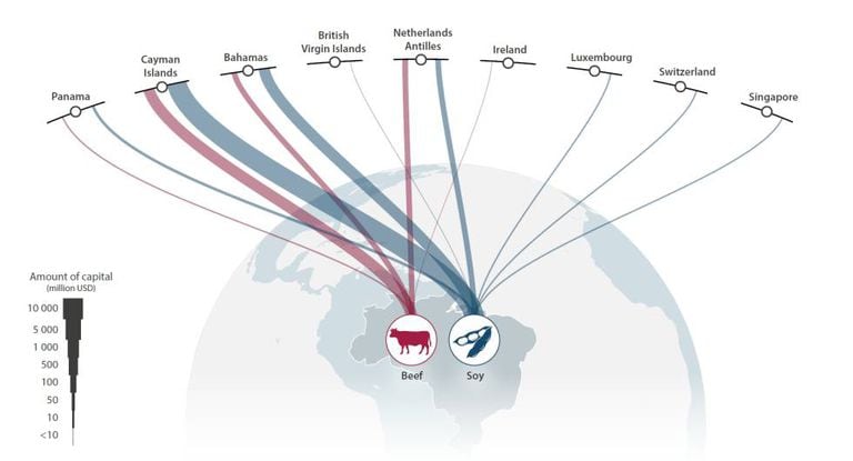 “No Brasil, no conjunto da economia e com relação a 2011, 17% do capital estrangeiro procedia desses paraísos fiscais, mas para o setor pecuarista e sojicultor foi de 68%”, comenta Víctor Galaz, autor principal do estudo e diretor-adjunto do SRC. As vantagens dos paraísos fiscais são bem conhecidas: seu know-how jurídico e fiscal, impostos mínimos e opacidade. Mas a razão para setores tão agressivos ambientalmente aparecerem mais conectados que outros com os paraísos fiscais é uma questão para a qual, como diz Galaz, “não temos respostas”.