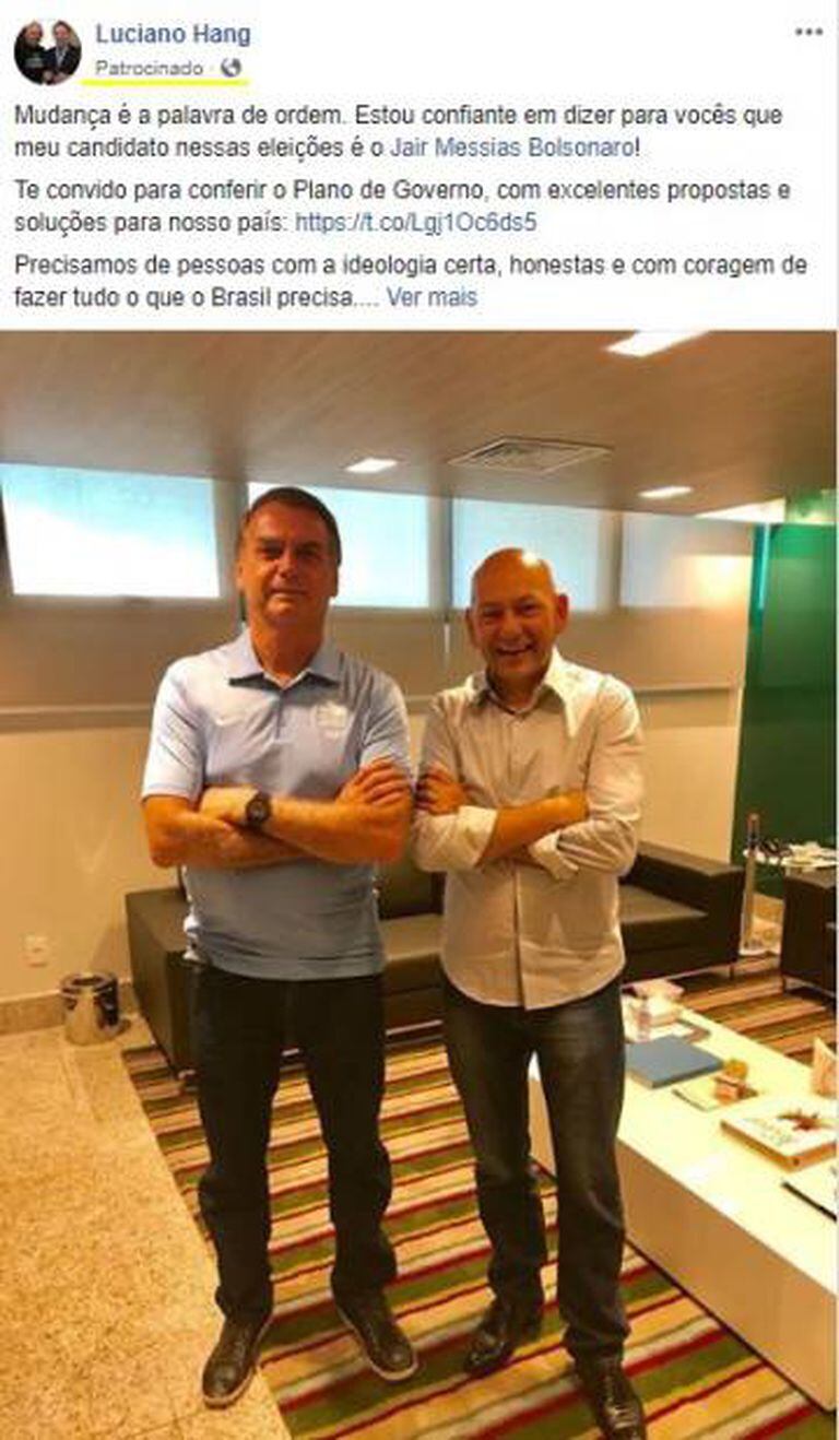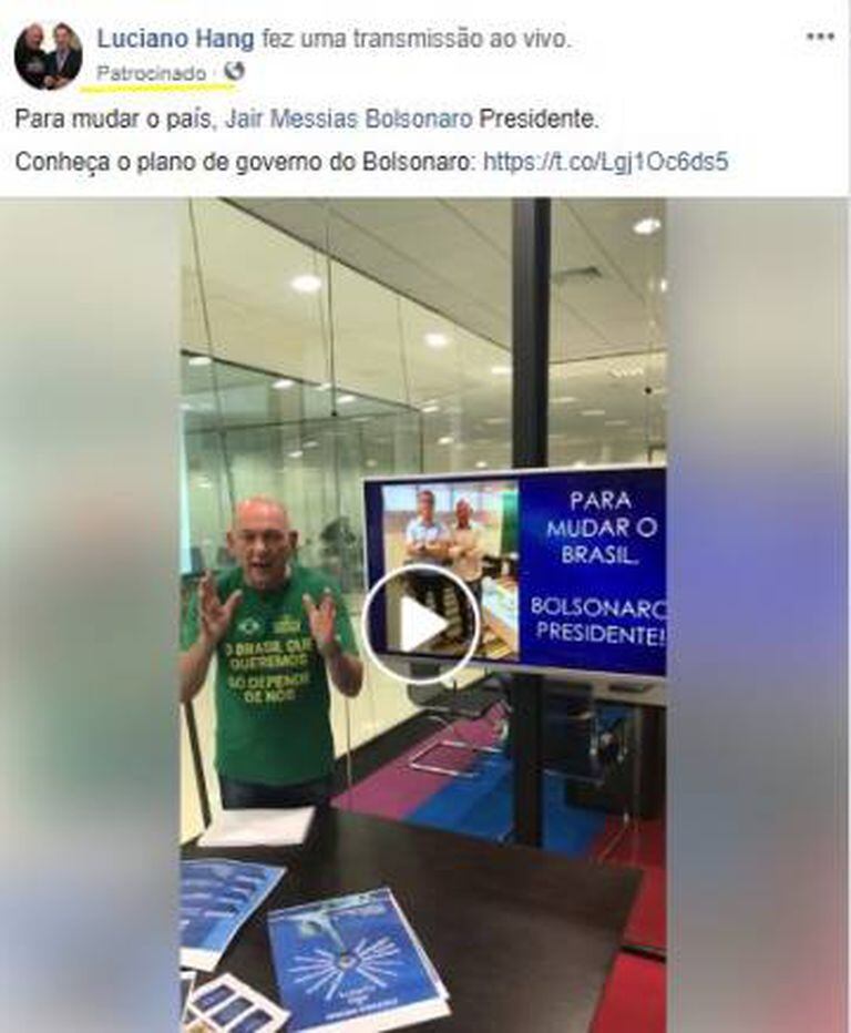 O empresário Luciano Hang, proprietário da rede de lojas de departamento Havan, foi às redes sociais anunciar seu apoio ao candidato Jair Messias Bolsonaro (PSL). Em uma transmissão ao vivo de 48 minutos no Facebook, o empresário defendeu o programa do ex-militar com um discurso inflamado. "O Bolsonaro é humilde, é simples, é prático, é comprometido com o país (...) Temos tudo para dar certo, por que damos errado? Porque votamos errado (...) Tenha você coragem, empresário ou não, cidadão, dona de casa, tenha coragem de abrir a boca e pedir voto. Vamos ganhar essas eleições no primeiro turno". Foi na última quinta-feira a a página oficial do candidato foi marcada na legenda do vídeo, que ao longo do final de semana recebeu 1,2 milhão de visualizações. O empresário também publicou em sua página uma fotografia em que posa com o militar da reserva convidando seus fãs a conhecerem o programa do postulante ao Planalto.