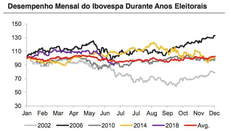 O curto-circuito por que passa o mercado financeiro brasileiro, com quedas e subidas bruscas no índice da Bolsa de São Paulo a cada pesquisa de intenção de voto, não é novidade em ano eleitoral, mas está mais intenso neste ano. Relatório publicado pelo Banco Santander em junho indica um aumento de 10% na volatilidade do Ibovespa durante os anos em que há votação majoritária. Levando em conta os resultados de 2002, 2006, 2010 e 2014, os analistas do Santander identificaram um desempenho médio negativo de 4,9% em maio e de 2,8% em junho. Neste ano, porém, a desvalorização acumulada em maio foi de 10,9%, e a de junho, 5,2%, ou seja, o dobro do normal. Parte das perdas dessa 'montanha russa eleitoral' costuma ser revertida em julho. Nas eleições anteriores, houve uma média de 1,7% de alta. Mas, neste ano, houve um comportamento atípico, com uma valorização acumulada no mês foi de 8,8%. Isoladamente, essa notícia poderia ser vista como positiva. Mas na verdade, ela traz uma confirmação da volatilidade excessiva em 2018, fora do padrão dos últimos pleitos.