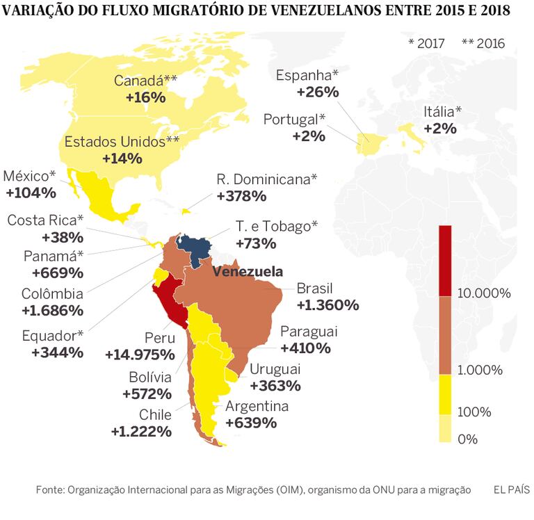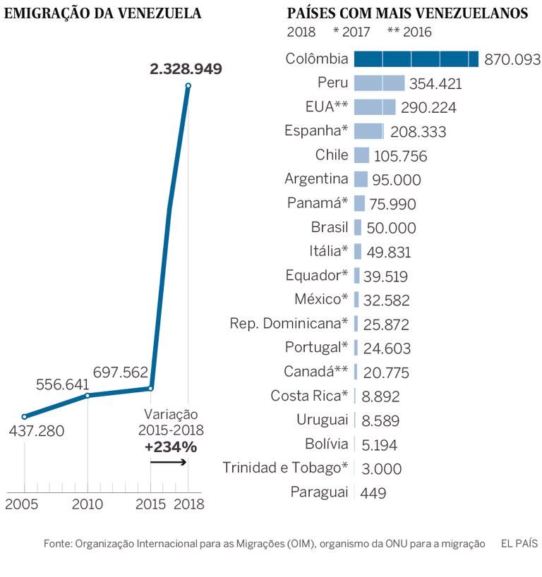 Só recentemente, por volta de 2010, a Venezuela deixou de ser uma nação de destino para se tornar um país de origem de emigrantes. E, a partir de 2017, o fluxo se acentuou para países de acolhida tradicionais, como os Estados Unidos, Espanha e Colômbia, mas também para os demais países da América do Sul, segundo uma análise da Organização Internacional para as Migrações (OIM). As saídas para o sul do continente aumentaram mais de 900% entre 2015 e 2017.