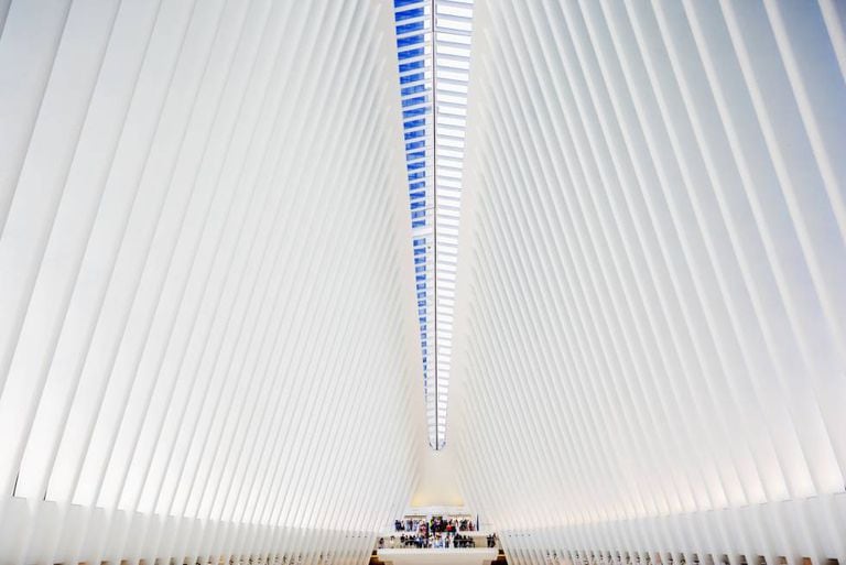Se lá mesmo tomarmos a linha E até a estação do World Trade Center, saímos no The Oculus, um espaço projetado pelo arquiteto Santiago Calatrava que abriga um shopping center e um terminal de transportes. Por um momento teremos a impressão de estar dentro do esqueleto de um diplodoco, cuja espinha dorsal seria a claraboia no alto. Embora possamos ficar boquiabertos, alguns nos lembrarão que o preço elevado do projeto – 3,7 bilhões de dólares – causou polêmica entre os habitantes da cidade.