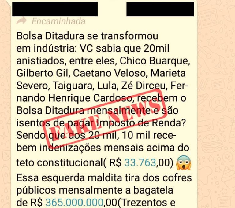 Essa fake news envolve além de políticos, grandes nomes da música brasileira! Postagens no Facebook que viralizaram também no Whatsapp afirmam que 20.000 anistiados após o término da ditadura militar brasileira recebem o benefício “Bolsa Ditadura” e de quebra estão isentos de pagar imposto de renda. Entre eles estão Fernando Henrique Cardoso, Caetano Veloso, Lula, Taiguara e Marieta Severo. Falso.