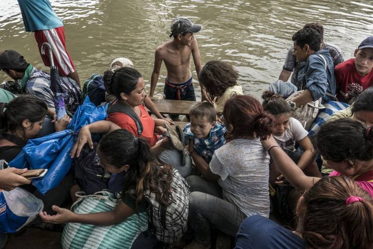 “Estou esperando há meia hora, mas acho que vou na próxima”, diz Kayli Maldonado, embaixo da ponte, na orla do rio do lado guatemalteco. “Só mulheres e crianças! Só mulheres e crianças! Os policiais não estão prendendo ninguém, vamos nos juntar todos!”, grita Paulo Vallesteros, um migrante hondurenho de 24 anos que organiza as travessias irregulares em pequenos barcos a motor, de madeira, chamados pateras, para o México. Quando Maldonado sobe na balsa, seu bebê começa a chorar e ela também. Viaja com seus quatro filhos. Outra mulher grávida irrompe em pranto. Cerca de 20 mulheres e crianças estão no barco junto ao rio.