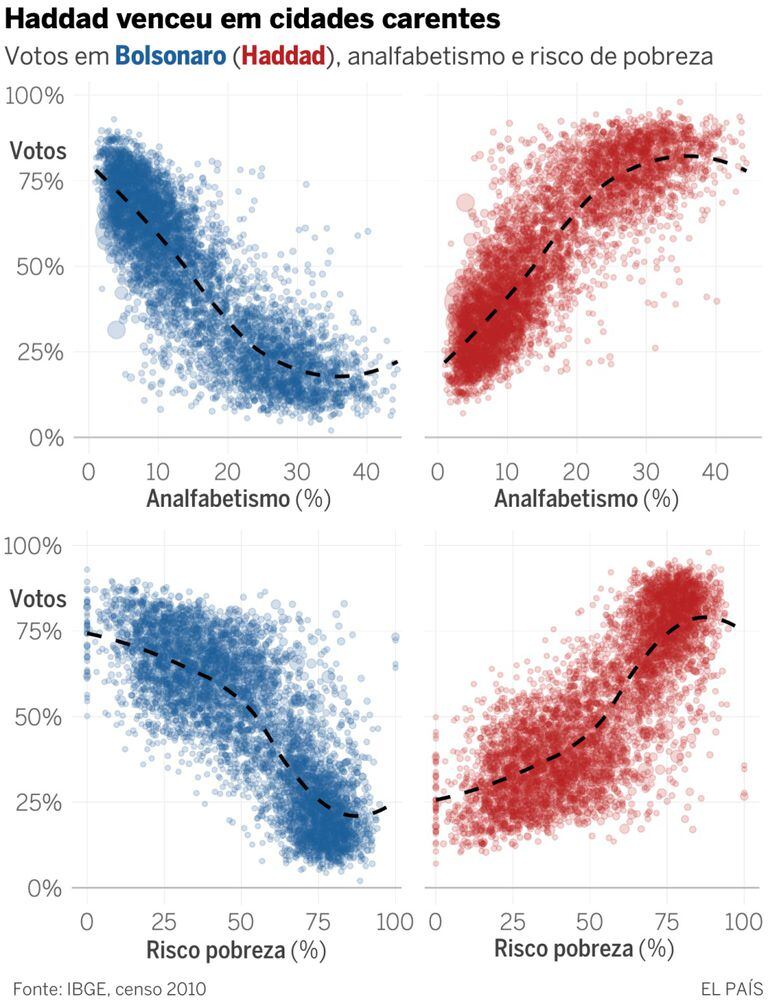Bolsonaro venceu nos municípios mais prósperos, enquanto Haddad conseguiu melhores resultados em pequenas cidades e municípios com altos índices de analfabetismo e pobreza. Imagine que dividamos o Brasil em duas metades, uma com os municípios com mais pobreza e outra com os municípios com menos: Haddad ganharia em 83% dos municípios do Brasil pobre e Bolsonaro faria isso em 87% dos do Brasil rico.