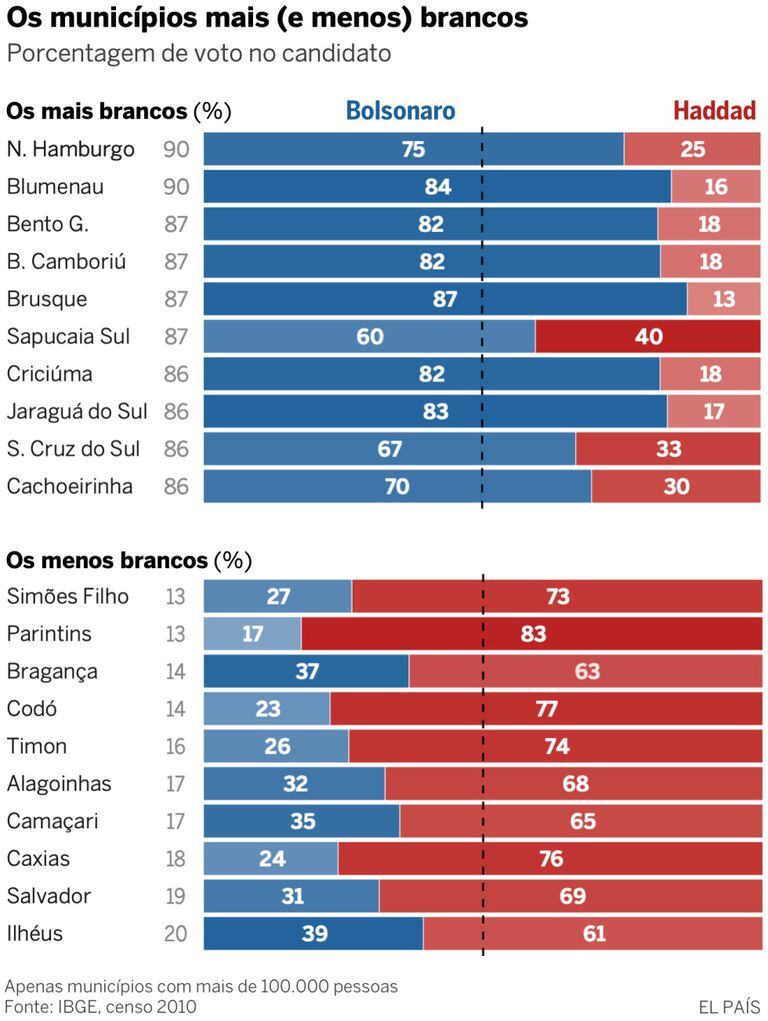 Bolsonaro ganhou nas cidades em que quase toda a população é branca, a maioria delas no sul do país. Em Nova Hamburgo, onde 90% das pessoas têm origem alemã, Bolsonaro conseguiu três de cada quatro votos. O candidato do PT teve resultados mínimos nessas cidades, mas ganhou em todos os municípios nos quais os brancos representam menos de 20% da população.